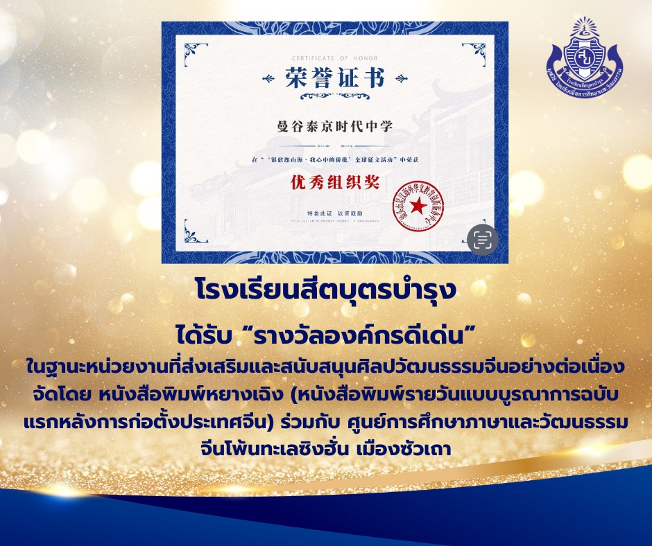 🏢 นอกจากนี้ โรงเรียนสีตบุตรบำรุง ยังได้รับ"รางวัลองค์กรดีเด่น" ในฐานะหน่วยงานที่ส่งเสริมและสนับสนุนศิลปวัฒนธรรมจีนอย่างต่อเนื่อง