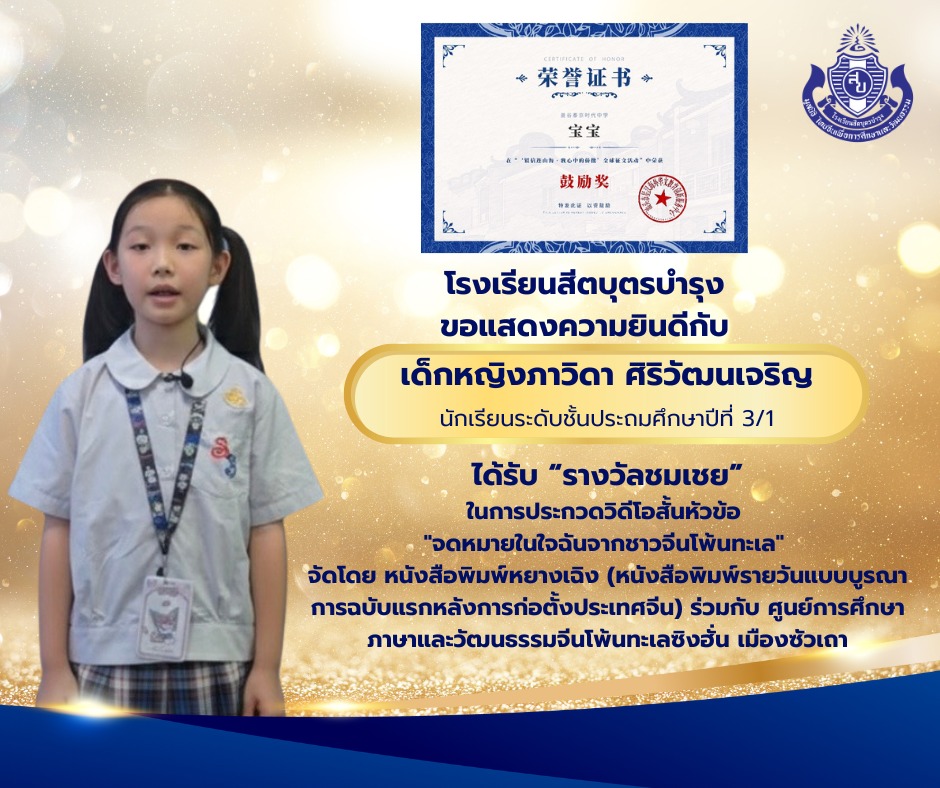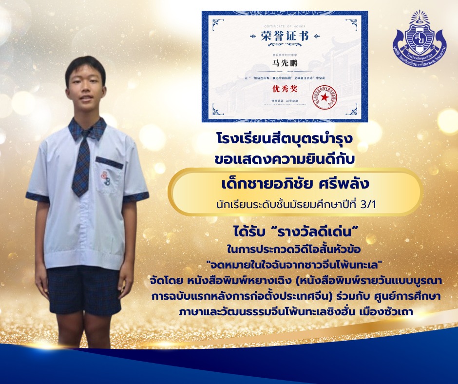 🏆 โรงเรียนสีตบุตรบำรุงขอแสดงความยินดีกับนักเรียนคนเก่งของเรา ในการประกวดวิดีโอสั้นหัวข้อ "จดหมายในใจฉันจากชาวจีนโพ้นทะเล" ซึ่งจัดโดยหนังสือพิมพ์หยางเฉิง (หนังสือพิมพ์รายวันแบบบูรณาการฉบับแรกหลังการก่อตั้งประเทศจีน) โดยมีผลการแข่งขันดังนี้